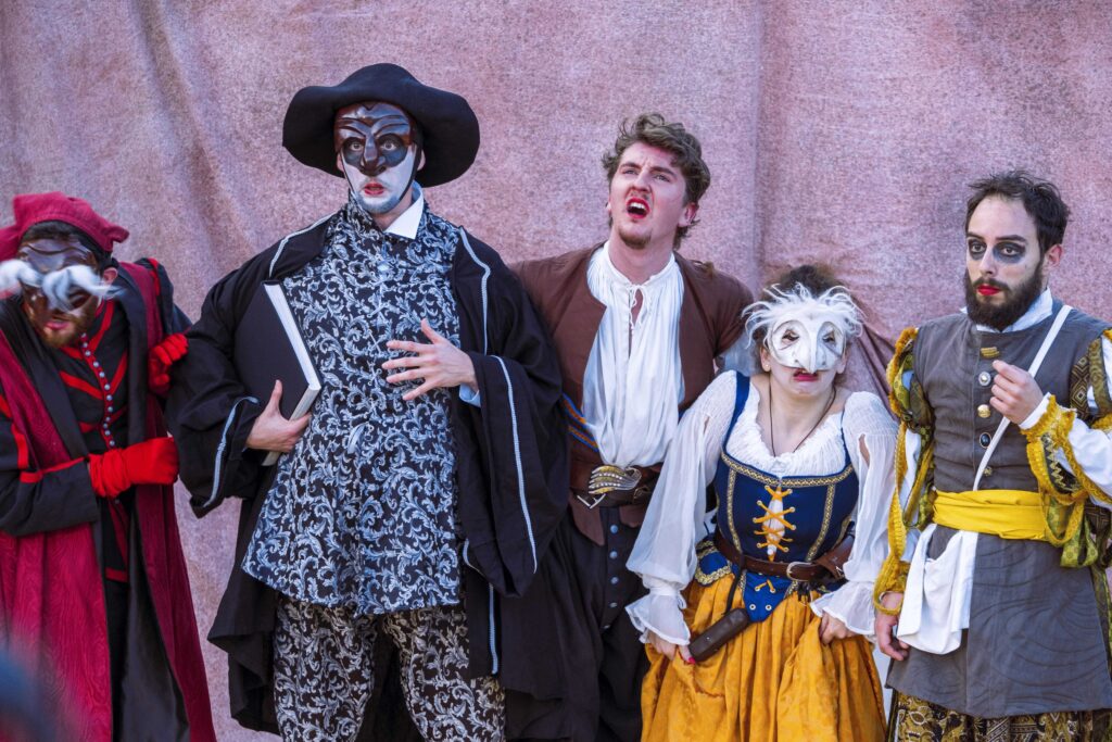 Canovaccio originale di Commedia dell’Arte scritto e diretto da Claudio de Maglio Con Giacomo Andrea Faroldi, Cristina Greco, Francesco Ippolito, Pietro Macdonald, Davide Riboldi Maschere Lemuri Mascherai Costumi Olga Mantegazza Prodotto in collaborazione con Civica Accademia d’Arte Drammatica Nico Pepe di Udine, Teatro del Sangro, I Nuovi Scalzi
